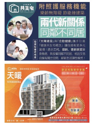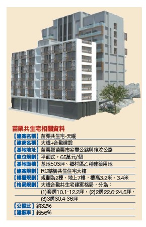 另外,東西向以三條重要省道沿線分為台1線的海線、台13線的山線、台3線的內山地區;南北向則以三條重要橫向道路沿線分為北橫公路(台1己+縣道124替代道路)的苗北、中橫公路的苗中、南橫公路的苗南,各以頭份市、苗栗市、苑裡鎮為發展核心。二、同鄰不同宅的共生宅─兼具同鄰又能相互照顧之功能由大暐建設與合勤建設攜手共同投資興建的「合勤健康共生宅-苗栗建案」,是台灣第二個共生宅開發案,基地位於苗栗交流道往苗栗市區方向,路程約六分鐘,位居國立聯合大學對面,鄰近苗栗市大千綜合醫院,兼具交通便捷與醫療需求。此外,在建築物規劃設計上係依據地形環境來搭配客群定位,分為前後兩棟,並以兩代宅同鄰不同居模式建構全齡學習住宅環境。本案是由三個合作夥伴共同投資,以大暐建設、合勤建設與地主共同合建方式產生第一個共生點,在此條件下將資產型態劃分為各自持有產權,以及部分出售、部分回租、部分保留經營日照中心的模式,另外,也與大學共同合作,提供莘莘學子以服務換取房租減免,而產生多面向的線型共生關係,最後再透過物業的經營管理來建構家屬與長輩同鄰不同居的照護共生連結關係。三、產品規劃設計─分棟同鄰共居,並兼具服務社區居家照護的外共生關係。本建案分為兩棟,前棟每層樓規畫有十戶一房產品,五個樓層共計五十戶套房,另外,一樓還規劃有便利商店、咖啡廳,地下室則有樂齡學習場域,整棟建築具備附照護服務機能的樂齡住宅,至於二樓及三樓則為小規模多機能機構,並具有日照中心、喘息服務的功能,進駐在此的居護、居服所辦公室,除了服務內部,也兼具服務社區居家照護的外共生關係。