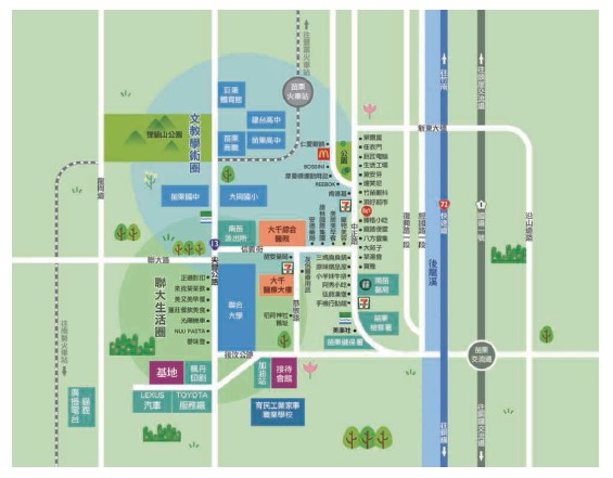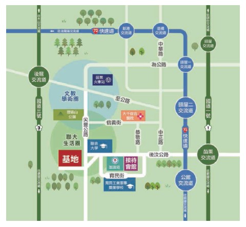 在當前人口快速變遷,加以建地取得不易,合勤健康事業如何說服地主,以合建方式建構複合式開發經營模式,並將資產型態劃分為各自持有產權,以及部分出售、部分回租、部分保留經營日照中心,再透過物業經營管理來建構同鄰不同居的照護共生連結關係,可否將整個建案選址、規劃設計以及未來經營管理方面分別說明,俾便讀者更加清楚了解同鄰不同居的照護共生之發展趨勢。首先,建案基地必須具備交通便捷性,並且在產品規劃設計方面,除了服務內部之外,也要兼具服務社區居家照護的外共生關係,才能發揮同鄰不同居的功能,並建構全齡學習住宅環境。苗栗共生宅實務案例解析:一、苗栗共生宅地理位置─具有交通便捷性優勢隨著高鐵、西濱、台鐵山海線大幅提升苗栗交通便捷性,加上竹南綜合運動公園、苗北藝文中心落成,苗栗不再是國人刻板印象中的西部「後山」,因此,有不少退休族反而鍾情於苗栗獨特山水景觀,可以享受田園與現代化並重的悠閒舒適生活。