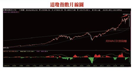 美元指數自3月9日聯準會宣布無預警降息後的首個交易日起,自94.63低點漲到103.01高點,短短9天累積漲幅高達8.85%,這在過去45年8次的金融危機中都曾發生過,因市場擔心流動性枯竭而採取現金為王策略,導致避險資金湧入美元。跟過去歷史所不同的是,過去金融風暴都是骨牌式的衰退,有階段性的;但這一次的經濟衰退卻是瞬間窒息式的,航空業、餐飲業、影視娛樂業、觀光業直接歇業,全球失業人口恐達2500萬人,美國財長預警美國失業率恐達到20%,比2008年金融風暴的10%失業率還高出一倍,高盛對中國大陸第一季GDP預測為衰退9%,全年GDP從二月的保5%預期,下修到保3%,全球經濟衰退幾成定局,就好像是染上COVID-19新冠肺炎的病人發病時感覺像是溺水,呼吸困難的窒息感,全球股市會不會也遭遇窒息式的下跌修正呢?道瓊測試18000支撐強度千禧年的網路泡沫導致那斯達克指數從2000年3月的5132高點下跌到2001年9月的1387低點,17個月累積跌幅達72.97%;2007年10月的次貸風暴讓道瓊指數從14198高點下跌到2009年3月的6469低點,17個月累積跌幅達54.43%,一波到底的總修正會不會在這次的道瓊指數重演呢?看起來機會頗大的,由於美國的病毒檢測能量嚴重不足,4月底之前是確診人數的高峰期,道瓊指數能不能挺過4月3日的美國3月大非農就業新增人數的利空測試,考驗18000點的支撐強度。