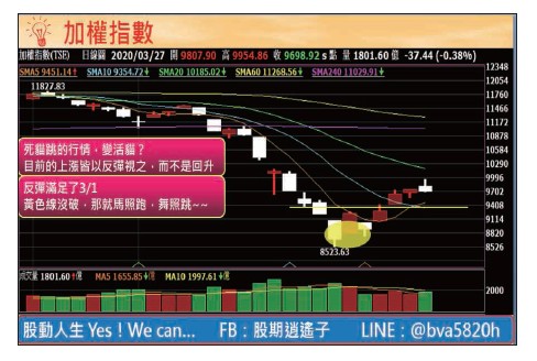上期周刊提到,台股三日不破低,站上短期均線後,確立了反彈格局,在全球股市已進入熊市,在中期均線都呈現下彎的情況下,後續的上漲都先以反彈視之,而不是回升,反彈的過程,上上下下的情況還是會有的,反彈上來分別會遇到幾個反壓關卡,九三○○、九七○○、月線反壓,月線這個地方也是壓力最大的位置!央行開著直升機大撒錢為避免新冠肺炎疫情影響經濟成長,美國聯準會宣布祭出「無限量化寬鬆(QE)、定向紓困」兩大政策,直接開著直升機於市場上撒錢,除了大舉購買美債,以降低借貸成本外,其範圍更是首度擴大到公司債、債券ETF,直接解決美元荒,同時聯準會提供一般家庭和企業前所未見的信用支持,這邊真的要給聯準會拍拍手,這回總算沒再當豬隊友,對症下藥,還滿有腦的!歐洲央行於三月二十六日隨後宣布取消先前推出七千五百億歐元緊急購債計畫的購債上限,跟進聯準會的無限QE, 賦予各國央行無限火力應對新冠肺炎疫情對歐元區經濟的衝擊!而先前人行宣布定向降準,向市場釋出五千五百億元人民幣,三大央行放水救市,加上其他各國投入救市,在這樣大撒錢的前提下,短短幾個交易日,台股一路過關又斬將,從三月十九日到三月二十七日已強彈千點,幾個反壓區通通交代了,個股的反彈也多有二○%至三○%不等的漲幅,那重點來了,相信也是各位投資朋友最關心的,台股是否就此展開回升行情?死貓跳,變成一尾活貓?恐怕沒這麼容易!目前包含台股在內,全球股市的反彈,都已經滿足了三分之一,也都來到了均線反壓區,如前所說,反彈過程上上下下的情況還是會有,愈接近反壓區,這情況愈是明顯,來到這位階,有跟著我們進場搶反彈的投資朋友不妨適時獲利一些,震盪壓回時再接回,而先前腳麻,套牢來不及走的個股,也可利用這個機會做個調整,少賠就是贏!因為這裡的行情不容易走V轉,也不是回升行情,從籌碼面來看,外資似乎也不認為這個盤會一路扶搖直上,行情若有回測,原本三個反壓區將變成支撐,一旦跌破,那行情就準備回測前波低點,三月十九日的低點再破,那台股就七千點見!