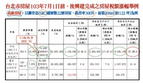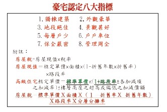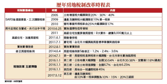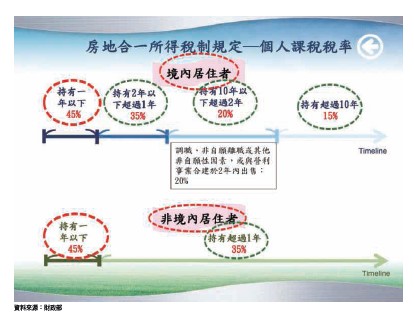 至於台北市對豪宅的認定標準有三項,第一是每戶總價八千萬元以上,其次是每坪一百萬元以上或每戶八十坪以上,第三則是符合前兩項要件的戶數達七成以上者,整棟都列入豪宅加重課稅。根據這一標準,當時例如帝寶、信義富邦、皇翔F4、元大一品苑、勤美璞真等豪宅全都被列為查稅名單。此外,2011年6月1日奢侈稅上路,惟2012至2013年預售市場更變本加厲的出現「秒殺」之熱絡景況,其中尤以桃園及新莊地區最為猖狂,而在房價高漲,交易資訊不透明情況下,終於催生了2012年8月1日開始實施的「實價登錄」制度。三、2014~2017年大幅調高稅率,五箭齊發壓抑房價─大幅調高持有稅,並且實施房地合一稅2014年6月4日,囤房稅的前哨站,「房屋稅條例第五條修正條例」完成修法,增訂住家用房屋屬供公益出租人出租使用之稅率為1.2%(同自住房屋);非自住之住家用稅率由現行1.2~2%修正提高為1.5~3.6%,地方政府並得視所有權人持有房屋戶數訂定差別稅率。為遏抑低利、低自備款情勢下投資客趁機大量囤房歪風,2014年7月1日「囤房稅」登場,成為房市轉折的第一支利箭,2015年,房市景氣急轉直下,隔年,2016年1月1日多箭齊發,稅率大幅調整的包括「公告地價」,全國調漲30.54%、台北市30.38%、宜蘭縣118%(最高);「公告土地現值」,全國調漲6.7%、台北市6.23%。此外,同樣是1月1日實施的「房地合一稅」,邊際稅率更高達45%(詳請參閱附圖);2017年「遺產贈與稅」再堵住最後一個「節稅空間」的漏洞,再將原遺產及贈與稅率由單一稅率10%,調整為三級累進稅率10%、15%及20%(詳請參閱附表)。