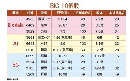 也正因如此,雖然目前全世界的新增確診人數仍然持續的攀升,但是黑暗總是會過去,只要歐美在未來的幾個月內疫情能夠減緩,死亡人數慢慢的被控制下來,美股不再急跌,台股就有機會進入新一輪的上漲行情,此時「BIG」概念股一定是市場追捧的對象,投資人應趁早準備因應。中國在疫情減緩後將全力推進5G的網路建設及相關的技術推廣及發展,希望藉由5G的新型基礎設施的規模效應帶動經濟復甦的意圖非常明顯。我們在此根據BIG產業鏈發展情況及財務面二高(高EPS、高毛利率)、一低(低股本)成長股選股標準,選出BIG 10潛力個股:譜瑞-KY(4966)、旭隼(6409)、力旺(3529)、世芯-KY(3661)、M31(6643)、精測(6510)、群聯(8299)、雙鴻(3324)、穩懋(3105)、祥碩(5269)等公司,行業範圍涵蓋高速運算、傳輸IP、晶圓測試卡、散熱模組、IC設計等。股票市場經典老話:「趨勢是你的朋友」,「順勢而為」。趨勢可分為產業趨勢及價格趨勢,人類文明依時間陸續發明了蒸汽機、電、互聯網,每項重要發明都伴隨了產業趨勢巨大發展並引領新的企業取得成功,站在趨勢上公司的股價在當代也一飛沖天,造成眾多未購買該企業股票投資人扼腕,二○二○年將是BIG發展元年,BIG將主宰未來發展十年!BIG未來更要BIG選股!