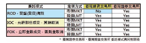 若真要說有什麼缺點,大概就是證券商必須支出一筆更新軟硬體的成本,以及上線初期所有可能發生的危險。以及當大資金法人的程式交易系統出狀況時,可能會造成特定股票的價格閃崩或急漲的短線異常波動。二、委託模式的變更臺灣證券交易所此次的交易制度變更還包含了委託模式的多樣化,其實就是仿照臺灣期貨交易所的期貨與選擇權已經行之多年的委託模式。但「有趣」的是臺灣證券所的「當日(當盤)委託ROD(Right of Day)」又仿出一番趣味來,因為「臺灣期交所的ROD是不能以市價方式執行的」。先跟讀者說明「市價」在國際金融市場上的定義,就是「交易所回單任何價格,交易人都必須接受。」如果你看到此處,沒什麼感覺,有可能是血液循環系統不良,更有可能是你的市場交易經驗不足所造成。舉例而言,筆者大約在十六年前還是小營業員時,有一位蔡姓離職同事把他自己,以及所屬客戶都交接給筆者。有一次因為立法院在審查金融RTC法案時,朝野大打出手,中午敲槌休會,立委們要去吃飯補充體力,準備下一場繼續火併!結果立法院槌聲一響……期貨市場的金融期貨立馬跌停,接著電子期貨與台指期貨也被拖累跌停!隔日盤勢續跌!該位蔡姓前同事及其違法代操的客戶全數重傷!在他以電話委託執行停損時,市場又因為大量抽單,造成委買區間真空狀態(就是委買單紛紛抽單),結果以市價委託回單的成交價格,與他當時電話中看見的價格,剛好差了五十個跳動點!斷頭已經夠慘了,還差點全額損失!所以,臺灣證交所此次「創意又創新」的「ROD市價模式委託」,可以說是個「可能創造出巨大風險損失的錯誤」。假設有一小型冷門股,因為平日成交量小於十張,股東正想抽腿賣股,偏偏有個天真的小綿羊用ROD市價想買進該股,又剛好該股東習慣性的以漲停板賣股票,在那當下小綿羊就會很驚訝的買在漲停板。再假設小綿羊想改成現股當日沖銷,想趕緊停損賣出,又用了一次ROD市價賣出,剛好又有人想要以跌停買進該股票,那麼小綿羊的賣出委託,就可能成交在跌停板。買漲停、賣跌停,消脂減肉效率特別好,肥羊都會變排骨。綜合以上,提醒證券市場投資人:1.請盡量以「讓價」取代「市價」,例如委買50、委賣51,你可以用ROD限價52買進。2.交易量冷門期權商品或股票,數量超過10以上,請改用FOK讓價方式。3.交易量熱門商品或股票,數量小於10,用IOC讓價即可(用FOK也可以)。