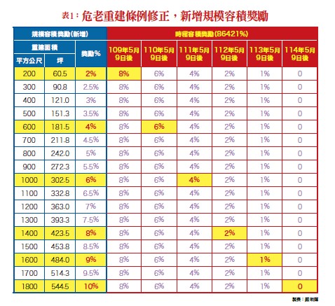 總統府在民國一○六年五月十日公布《都市危險及老舊建築物加速重建條例》(俗稱危老條例),施行申請期限至一一六年五月三十一日,更明定政策實施後的前三年內提出申請者,可多一○%的「時程獎勵」,容積獎勵上限值可達四○%,但三年時間咻一下,很快在今(一○九)年五月九日截止。規模獎勵將接棒不少人建議能延長獎勵時間,但內政部次長花敬群多次明白表示,絕不延長,但為了不讓好不容易燃起的危老都更熄火,則另闢長城,研擬增列「規模獎勵」項目,鼓勵大面積開發重建。為何會新增「規模獎勵」項目?根據營建署署長吳欣修在一場座談會上表示,曾有一位土地面積才二十六坪的地主都來申請,造成危老重建效益較有限。美商ERA學習長顏明輝表示,行政院於三月十九日通過《危老重建條例》修正草案,規劃一○%時程容積獎勵在五月九日到期後,分「時程獎勵」遞減+「規模獎勵」遞增方式。經立法院於四月八日初審通過危老重建修正草案,原內政部規劃「時程獎勵」,今年屆期後逐年降為五%、四%、三%、二%及一%,經協商討論後,修改為八%、六%、四%、二%及一%(表一),而新增「規模獎勵」依內政部版本通過,預期在本會期三讀修正通過,唯新修正的時程獎勵,加上新增的規模獎勵,二者合計若超過一○%時,最高仍以一○%為限。