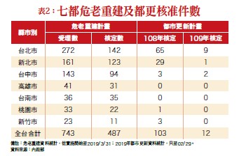 「危老條例」與「都更條例」最大的差異,被稱為政府另開了一條「加速」審查的快速道路,因此,自一○六年五月十日公布實施以來,依內政部危老重建專區統計,截至今年三月三十一日止,全台有七四三件受理申請,而核定數為四八七件(表二),成功率高達六五.五四%,更提振了危老重建參與者的意願。安信建築經理公司總經理張峰榮表示,以前《都更條例》需要一個「實施者」,大都由最後整合成功的建商扮演,但《危老都更》並沒有「實施者」角色,大都由想危老重建的住戶或地主擔任。但以往,都更整合之所以曠日廢時,主要是整合難度高,不管是「權利變換」或是「協議合建」,整合者都要召開數十次,甚至上百次的說明會,但都更不易,還有「釘子戶(不同意戶)」問題。以前,還有整合者跟老舊建築的住戶進行溝通、協調,但如今,沒有「實施者」,即便政府加強培訓「危老推動師」,但緩不濟急,此外,各縣市政府也都在官網上設有「危老重建專區」、「懶人包」,但很多人還是霧煞煞!中華民國地政士公會全聯會榮譽理事長王進祥以其專長,多次獲各縣市地政相關單位邀請去演講,光是「危老重建之法制與開發整合之技巧與策略」,就列出「危老vs.都更沿革、危險老屋現況、危險老屋政策與本質、危險老屋重建條例(法制)、危險老屋問題、危險老屋後勤支援(平台)及開發整合之突破與技巧」等,就七大項,有時連房地產開發商都不太懂,更何況一些平民百姓。