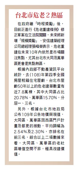 建經公司積極推動危老重建因此,除了各縣市政府的危老推動師四處幫民眾解答及協助申請作業之外,現在還有更多建築經理公司加入,從以前只是支援《都更條例》,大都是各「實施者」所需「金融援助」的角色,一躍成為危老都更「建築開發總舵手」的推動角色。張峰榮表示,根據內政部統計,去年危老申請案較前年成長逾三倍,且在老屋基地面積有限的前提下,「自地自建」逐漸取代傳統「合建模式」成為地主老屋重建的新選擇。過去的都更,開發公司會整合完案件,然後讓渡給建設公司,賺取整合佣金,但安信所設計的「全案管理」,主要是協助地主(或開發商)自地自建,開發商可直接轉型為建商,而建經公司就成為該案的合作夥伴。安信建經接獲不少危老屋主希望協助取得危老重建容獎的需求,也在去年受理四件危老自建個案,包含重建計畫已核准的新北市「鶯歌案」、北市「信義路二段案」,以及計畫申請中的北市「延平北路案」及「長安東路二段案」。安信建經所推廣的「全案管理」服務內容採自地自建的客製化模式,針對地主的需求及想法協助規劃出最適合的重建方案,以大同區「延平北路案」的危老重建個案來看,因人數多又缺乏傳統開發商或建商角色主導及整合,執行過程中較難以達成共識,易導致案件胎死腹中。最後,針對「延平北路案」,安信建議地主們成立法人主體、建立股東會來執行重建,即可簡化重建及融資信託流程,並利用決議機制解決意見分歧問題,提升成案機率。張峰榮說,此案基地約一百五十坪,為數棟屋齡平均超過五十年以上之建物,其中有一棟還有九十年屋齡,總銷量體逾千坪,為地主量身打造地上十二層、地下二層之全新住宅大樓,目前已掛件危老重建計畫,預計今年請照動工,達成地主多年來的重建心願。危老戶數少也有難溝通者