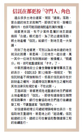 曾從事都更長達一、二十年經驗的張峰榮指出,大家都以為都更不易,是因為有一兩百戶,意見不易整合,但即便是危老重建所針對,四樓高的老舊建築,一個樓梯共八戶來說,意見整合只要一戶難溝通,照樣沒辦法達成「一○○%」的基本門檻。張峰榮另分享了建經公司在危老重建,易受地主青睞的關鍵在於過往向銀行「融資」的錢脈關係。以占地約六百二十坪住商混合的「鶯歌案」重建案來說,地主本身就是旭碁開發,在危老條例剛開始推行時,因該家族祖產的產權所有人就是父子共三人,原想自地自建,但詢問多家銀行爭取融資,仍無法獲得滿意的條件,之後,為爭取最優惠的融資條件,找上安信建經。安信建經透過「全案管理」替客戶代建執行,歷經一年多良好互動,此案成功取得上海銀行融資撥付,危老重建計畫也順利核准,計畫打造地上七至八層、地下一至二層的電梯華廈,預計明年完工。