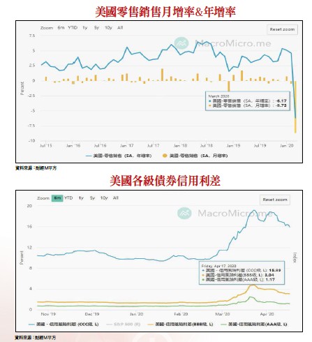 舉例而言,以消費增長為主軸的美國經濟,消費數據已出現防疫斷層,美國商務部新公布的三月零售銷售額較前月衰退八.七%,不僅低於市場預期的衰退八%,更創下官方一九九二年開始追蹤此數據以來的歷史新高。十三個主要類別中的八個類別較二月下降,其中服裝商店下降五○.五%,家具下滑二六.八%,餐館和酒吧衰退二六.五%為最大,佔零售銷售額二○%的汽車銷售也下滑二五.六%,因油價大幅下跌,加油站的汽油銷售額也大幅降低一七.二%。另就年增率而言,三月零售銷售年增率由前期的年增四.六%陡降至年衰退六.二%,重點是目前的數據可能還不是最壞,新冠肺炎疫情造成的衝擊才開始逐漸浮現,仍需持續關注追蹤。另外,國際能源總署(IEA)也表示今年全球石油需求降幅將創下紀錄,預期二○二○年全球石油需求將下降九三○萬桶/日,同時預估四月原油需求下降二千九百萬桶/日,遠超越 OPEC+才剛達成共識的減產幅度。近期國際原油連續崩跌的情形下,也需要一段時間來觀察對高收益債市場之衝擊程度。雖然目前的信用利差開始緩步下降,金融市場暫時沒有斷鏈危機,但仍舊不宜掉以輕心,因為降幅還不足以讓人放心。全球陸續重啟經濟活動 五月份為觀察重點新冠病毒疫情發展至此,既然限縮了股市向上空間,是否再次引發連續性崩跌呢?答案是「不至於」。目前全球主要經濟體之商業活動雖然受到管制措施影響,但是仍有一部份消費需求不至於消失,只是遞延而已。況且部分地區可望因疫情受控而逐步鬆綁管制。