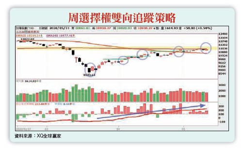 投資人關心的不再是現況多糟,而是未來復甦要多久?隨著歐美各國陸續解除經濟封鎖,企業逐步回到封鎖前運作軌道。疫情衝擊最嚴重旅遊、餐飲及服務業,都是人群互動密度高的產業,在疫情完全穩定下來前,復甦步調相對緩慢。但生技醫療、零售及科技業,需求性反而因疫情加速放大,經濟解封後,相關企業也如脫韁野馬般積極布局下半年,因此市場投資重心也會放在這些產業。台灣的電子產業表現領先大盤,在OTC股票表現更加強勢。主因是電子族群受影響的只有二月的斷鏈衝擊,但非大陸地區的產線仍正常運作出貨。接著台積電法說宣布維持資本支出後,宣示整個產業未來基本面無虞,更激勵資金湧入。而這一波推動台股反彈的主要資金為投信,其操作主力就在OTC,才會出現如此表現差異。另一方面,受惠回流的海外資金挹注,台股的資金動能也相當充足。在具備基本面與資金面的優勢下,預期台股波段表現將相對強勢。外資在台指期未平倉淨多單四萬一千多口,意味著外資對台股後市表現看法偏向樂觀。自營商選擇權未平倉部位,買權的Sell Call從一萬二千多口大幅減碼至八千多口。賣權Sell Put則從四萬多口小幅縮減至三萬九千多口,顯示內資的態度也偏向樂觀。整體觀察,技術面與籌碼皆偏多,可運用溫漲(買權多頭價差)策略布局。