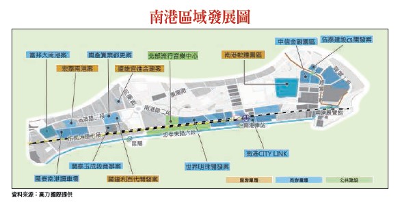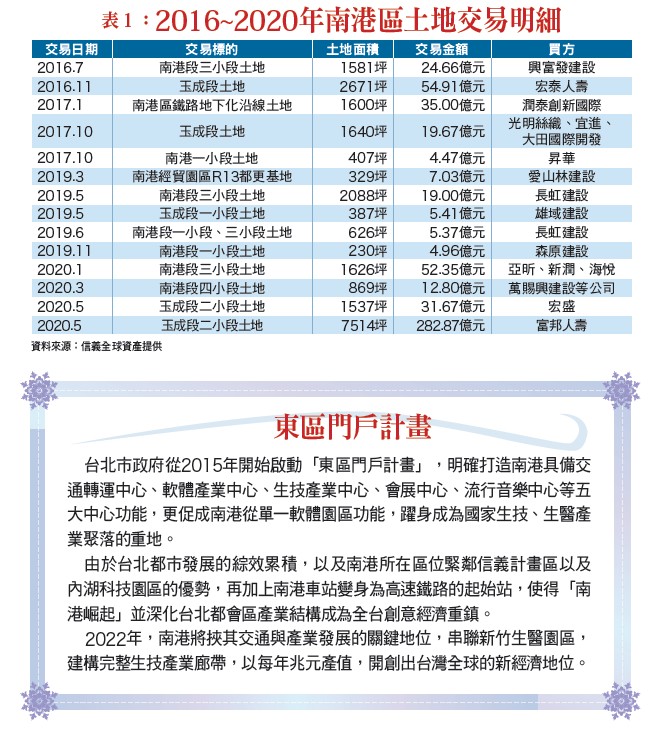 東區門戶計畫 南港華麗轉身「東區門戶計畫」主要由國家生技產業廊帶、流行音樂與文創產業、軟體及會展產業為主軸構成,並有四鐵共構之「南港車站」發揮高效交通轉運功能,結合區內多處重劃與更新計畫,使得南港區都市發展面貌煥然一新。田揚名說,大南港案在多方競逐下順利標脫,溢價率九.六四%,也證明在低利環境下,面對全球疫情衍生之各項經濟衝擊,精華地段不動產釋出成為各界焦點,尤其可塑性極高之大面積土地在商用不動產市場對企業總部或長期投資需求下,成為市場資金競逐之優質標的。大南港案過往由於由七家公司持有,歷經超過十五年以上的投資、整合、變更、市地重劃,同時間也見證了南港成為台北東區門戶的發展,在多家大型壽險與建設公司近一個月競逐下順利標脫,其優異區位與開發規模,使其成為東區門戶最期待之投資開發標的。信義全球資產經理王維宏表示,南港區隨著中信金、HP惠普等大型企業東進,也帶動一般企業或外商公司將目光轉向南港,目前南港區主要的發展重點為南港經貿園區,包括軟體園區一至三期、中信金總部及南港展覽館所在地。南港近五年交易五六○億元第二個發展重心則是南港車站周邊,包括三鐵共構的南港車站BOT、南港轉運站以及由潤泰取得東側商業區公辦都更案。未來隨著南港調車場、國揚大南港案所在區域的開發,靠近昆陽站這一側將急起直追,呈現三極化發展,進駐產業也擺脫過去以製造業為主的廠辦產品,轉向以服務業為主的商業辦公產品。