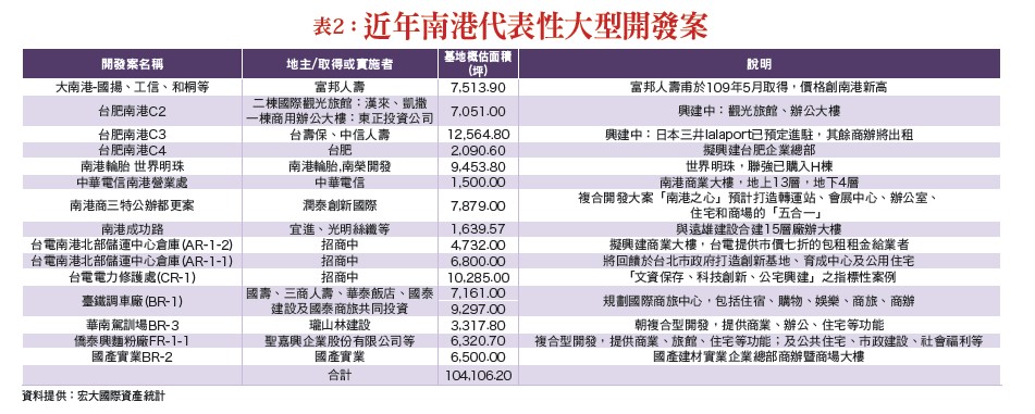 全球資產統計非地上權的土地交易,包括興富發、潤泰新、愛山林、長虹、亞昕、新潤、海悅、宏盛、雄域等建商進場,加上宏泰人壽及富邦人壽,近五年就在南港交易超過五百六十多億元,南港成為台北市土地交易最熱絡的行政區(表一)。由於後續仍包括政府及民間都有多起大型開發案正陸續進行中,預估中長期來看,南港區仍然後市可期。信義房屋不動產企研室專案經理曾敬德表示,南港地區經過一次一次的標售過後,台北市新東區門戶的輪廓也日趨明顯,尤其是在近期疫情、股災等市場動盪之下,標售結果可視為房地產的風向球,也為當前的局勢下帶了新的風向。宏大國際資產公司總經理陳益盛表示,大南港案基地約七千五百多坪,雖然不是南港最大開發案,卻是難得釋出的大規模基地,因此標售前即已吸引來各大壽險業、建商及房地產業者關注,視為對南港未來發展的試金石。未來五年新增五十萬坪供給陳益盛說,由於該案資金龐大、開發時程冗長,能參與投標的沒幾家,壽險業滿手資金算是抓住好機運。據統計壽險業者去年獲利以國泰、南山、富邦位居前三,資金最充裕,但南山以連續取得信義區信義行政中心、世貿三館二大地上權案,國壽則在因台鐵南港調度場已經有約一萬六千餘坪基地的合作開發案,所以沒有急著出手,富邦順勢投標高過新壽的第二標而取得該案。 南港主要是腹地大、交通到位,所以開發商、壽險業者搶進,加上市府積極推動東區門戶,也將創造就業機會、引進人口,因此不只商業需求,連住宅需求也很大,而近年大型開發案不少(表二),基地有十多萬坪,預計未來五年可供租用的面積將再增加五十萬坪以上,商辦及純辦供給大增,但未來的招租競爭也非常大。