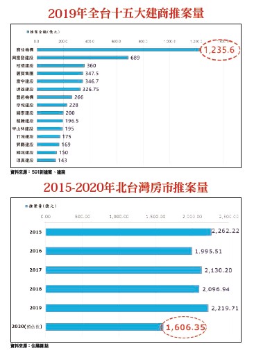 二○一九年,寶佳機構推案量一二三五.六億元蟬聯冠軍,相較於第二名興富發建設六八九億元,第三名冠德建設三百六十億元(詳請參閱附圖),差距很大。這一驚人數據透露什麼玄機?可分為兩部分來探討,首先,究竟有沒有炒作嫌疑?其實,任何一次房價上漲,難免都會有炒作話題,雖然二○一五年之後房市即逐漸呈現跌價趨勢,惟自二○一八年美中貿易戰以及台商回流之後,還真出現了不少利多話題。首先,台北市可供建築用地很有限,尤其精華地段建地愈來愈少,房價下跌不易尚可理解,至於其他縣市愈來愈多的推案量,難道建商都那麼樂觀自信?二○一九年首見建商推案量超過一千億元,該機構二○一八年銷售約八、九千戶,二○一九年銷售超過一萬戶,主要原因在於旗下數十家公司遍佈全台,並且大都是毛胚交屋,房價便宜策略成功。至於有些上市櫃公司挾著長期建立的品牌信譽,售價雖高,仍有固定客群,主要原因在於區隔產品定位策略成功。