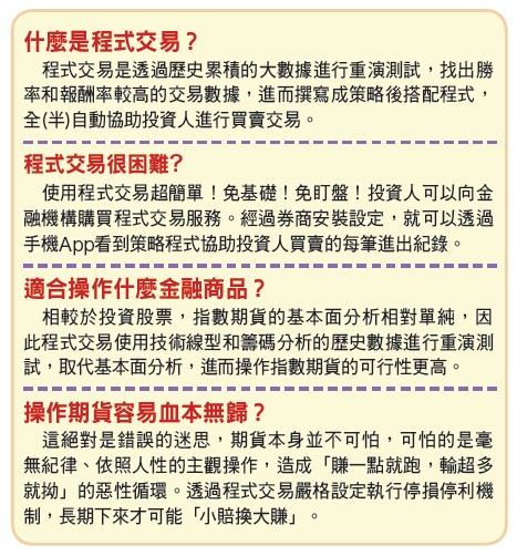 《AI進化論》系列專欄推出以來,透過簡單明瞭的方式說明程式交易的重要觀念,將程式交易從原本科學怪人的幻想,搖身一變成為貼近大眾的投資工具。虛擬體驗 程式交易第一手觀察許多粉絲透過閱讀專欄,已經成為程式交易小專家,也透過加入免費虛擬體驗,感受程式交易的好處,成為實單操作的一員。初次閱讀專欄的讀者歡迎透過左頁小問答集,瞭解前期專欄的重要觀念,跟上程式交易的趨勢腳步。上一期提到,許多稍微瞭解程式交易的粉絲加入體驗,喜歡詢問「體驗中的策略程式勝率多少?」然而,這個問題不只有錯誤迷思更潛藏危險。程式交易勝率迷思 潛藏虧損風險市面上許多不肖程式交易服務商,主打策略程式勝率很高,意圖欺騙投資人。但試想,如果每次進場勝率高達九成,九次都贏一點點,輸一次全部賠光,九成的勝率也顯得沒有意義。投資人購買程式交易服務,務必細問策略程式的「賺賠比」,也就是「平均每筆獲利/平均每筆虧損」,我們以實例說明此觀念:策略程式一