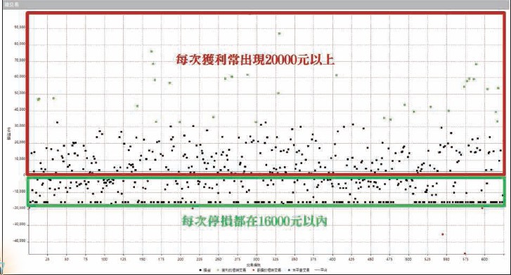 勝率50%、賺賠比1.5(平均每筆獲利3,000元/平均每筆虧損2,000元)如果交易一百次,預期獲利虧損情形是50×3000–50×2000=賺50,000元策略程式二勝率80%、賺賠比0.2(平均每筆獲利1,000元/平均每筆虧損5,000元)如果交易一百次,預期獲利虧損情形是80×1000–20×5000=賠20,000元兩支策略比起來,雖然策略程式一勝率只有五○%,經常執行停損,卻因為嚴控停損,把停利空間放大,整體帶來獲利;策略程式二儘管勝率高達八○%,連續賺一點點就跑,卻因行情不如預期就拗單出場,造成整體虧損。總交易分析圖 一窺停損停利態勢