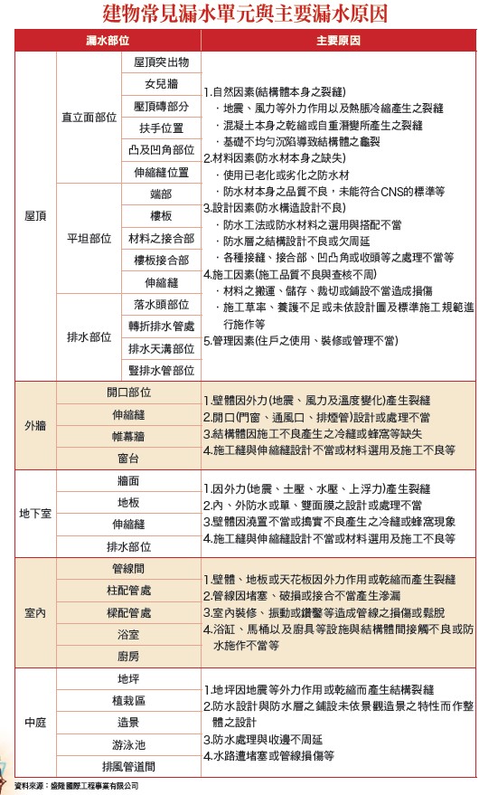 Q(發哥):一般建築物產生滲漏水的部位都在哪?又是什麼原因造成的呢?A(專業廠商):建物產生漏水的部位與原因相當的複雜,若非逐一抽絲剝繭,往往不易真正找出漏水源頭與部位,然從工程實務與相關漏水案例顯示,建物完工後有關漏水原因之追究,一般可從防水層之漏水以及非防水層之漏水(如樑、柱內之給排水管線)等兩部分加以探討。1.防水層之漏水:因防水層施作之漏水問題可分別從設計、施工或材料的觀點加以釐清。短期內或一至二年左右即產生漏水,應可歸究於施工品質不良所引起;較長期才發生漏水時,則大致上可歸因於材料本身品質劣化所致。一般而言,建物發生漏水的部位主要可歸納為外牆、屋頂、室內以及地下室之漏水等四大部分。2.非防水層之漏水:國內建築之配管型態往往基於美觀等要求,習於將各種管線配置在結構體中,一旦給、排水管龜裂、破損或堵塞,則漏水現象因而層出不窮。為了防止此類問題的發生,建議不將給、排水配管埋入結構體內,而採用其他方式修飾。簡易判定方式,若是不分晝夜或雨晴均在漏水者,可能是給水管接頭漏水;但若只在下雨天,且非頂樓之柱邊(有埋設排水管)漏水,則應是排水管接頭之漏水問題。 此外,另一個產生漏水的原因,大多是購買二手屋後,經常因裝修振動或水電配管之鑽孔等因素而對防水層造成損傷或直接的破壞,進而產生漏水現象。尤其在屋頂、外牆、浴廁以及地下室等水分侵入可能性較高的部位,一般均有防水層的施作,故在裝修時應特別注意防水層之位置及性質,否則防水層一旦遭破壞勢必後患無窮。Q(發哥):滲漏水問題產生後,常間接引起之發霉、腐蝕以及白華(壁癌)等病變,是否可以簡單分別說明一下。