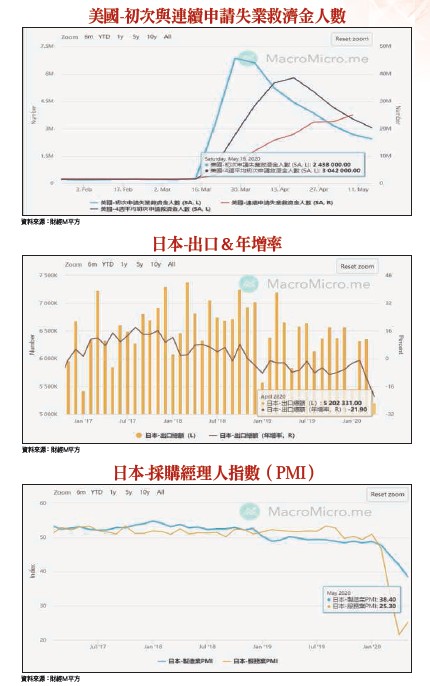 不只是美、歐的實體經濟受到重創,亞洲的日本也好不到哪。日本新公布的四月出口額年減二二%至五.二兆日圓,創下二○○九年十月以來最大跌幅,其中汽車、機械、紡織及化學等主要出口品項需求大幅萎縮。其中,日本對美國出口額四月下滑三八%,對美國貿易順差年減七五%,四月對歐洲出口額也下滑二八%。研究機構IHS Markit公布的日本五月製造業PMI初估值從四一.九降至三八.四,是二○○九年三月以來最低點。在各子項指數當中,五月製造業生產指數跌至三一.七,同樣是十一年多來最低點。五月服務業PMI為二五.三,距離五十榮枯線仍相當遙遠。Markit經濟學家黑斯(Joe Hayes)表示,根據四~五月PMI資料推算,預期日本第二季國內生產毛額(GDP)年率季減約一○%以上,若與去年同期相比,跌幅最高可達二○%,且將是連續第三季經濟負成長。