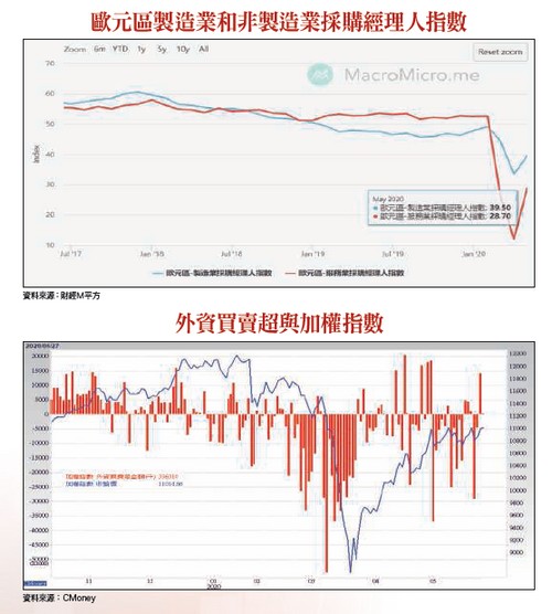新公布的歐元區綜合採購經理人指數(PMI),五月初值為三十.五,仍遠低於五十的榮枯分界線;其中,服務業PMI為二八.七,製造業PMI則為三九.五;綜合PMI已是連續第三個月在五十之下,且仍低於上次金融危機創下的前低,顯示新冠肺炎疫情確實對經濟造成空前的衝擊。