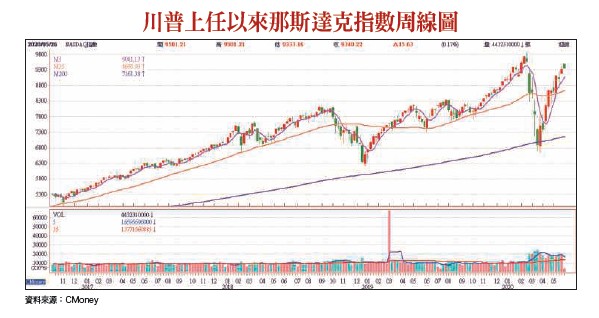 本波美股走勢在FED以直升機撒錢的方式挹注流動性之下,呈現超強之反彈力道。S&P500指數期貨於五月二六日電子盤距離二○一九年底封關位置,僅差約七.三%就收復今年以來的跌幅。NASDAQ指數期貨更神奇,不但比二○一九年底封關位置高出九.七%,距離二月份的歷史高點僅剩一.七%,完全感受不到病毒的存在。