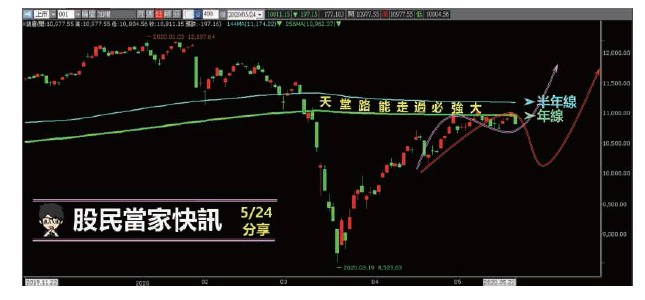 看來六月逐漸遠離新冠肺炎,特別是台灣防疫世界NO.1,但我們還是得學著繼續與病毒和平相處大半年,政治上的紛擾將是六月最難處理的議題,台股來到半年線、季線反壓,年線三次叩關沒過,要就奮力一擊長紅突破,否則就拉回整理重新蓄積動能─喝了再上,六月這段「天堂路」能走過必強大。