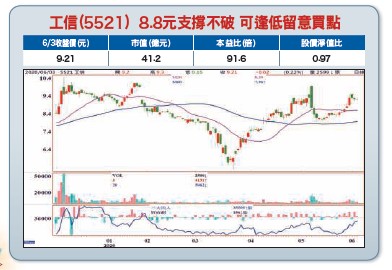 工信(5521)以及國揚(2505)在四月九日公告將公開標售大南港土地時,建議大家可進場布局,五月七日公告由富邦人壽標下大南港土地,五月八日也如預期出現短線利多出盡,早盤做獲利調節。而當五月中旬股價回測季線支撐時,我們再度在前兩期周刊中建議大家可逢低買回來,短線在清洗浮額整理完之後,應該有機會再上來反映第二季財報利多,現在果然又震盪走高上來。
