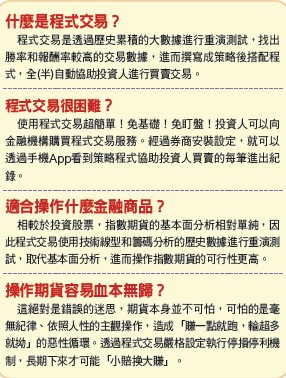 前一期提到,每支策略程式都有獨特屬性及適合它的盤勢,因此往往盤勢對了連續獲利,但遇到不適合的盤勢,也會出現連續虧損和績效回落。讀者正式使用程式交易前,可以詢問服務人員,過去最大連續虧損或最大績效回落的金額。唯有事先打好心理建設,才能順利度過策略程式的黑暗期,迎來績效成長的時刻。