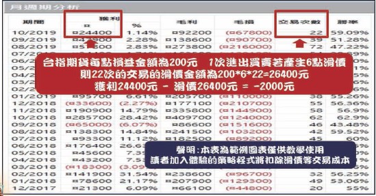 舉例來說,本文的月周期分析表顯示,二○一九年十月獲利二四四○○元,但如果這項統計未扣除滑價,二十二次交易每次都有六點的滑價,則實際上扣除滑價二六四○○元後,該月實單交易根本是虧損二千元!