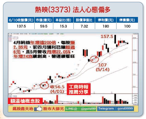 (2)額溫槍訂單旺,泰博及熱映營運續看俏:新冠肺炎疫情延燒,額/耳溫槍需求旺,泰博(4736)、熱映(3373)營收及獲利都交出創新高的好成績,泰博月營收衝上6.34億元,年增105%,月增21%。熱映五月營收也達2.57億元,連續四個月創新高,第二季業績將續攻頂。