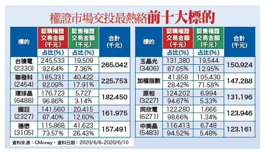 個股部分,台積電第一季營收一○三.一億美元,毛利率受惠稼動率提升,上升至五一.八%,EPS達四.五一元,令市場驚艷,權證交易持續熱絡。台積電第二季法說會上表示預期HPC與5G將帶來長線需求,因此維持原先資本支出規劃不變。整體先進製程進度未受疫情影響,台積電製程領先地位依舊穩固。