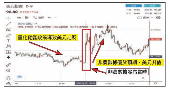 非農業就業數據受上一個月受聘人數(不含農業)變化影響,如果指標比預期高,則視為美元強勢(上漲),相反,則應視為美元弱勢(走跌)。美國六月五日公布非農數據,五月新增就業二五○.九萬人,失業率下滑至一三.三%,兩項指標皆遠超過市場預期,雖然美國勞工部資料統計事後證實有誤,五月失業率真實數字可能落在一六.四%,但仍遠優於預期,激勵美股四大指數收紅,美元氣勢目前強勁。
