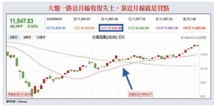所以上篇專欄文章只是給新讀者的提醒,要是之前沒有買在低點的,上周一一○○○點附近也可以進場追,停損點一樣放月線。