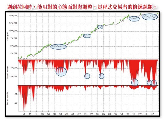 這兩周在程式交易績效創高後,迎來了約莫12%的拉回,許多剛開始進入程式交易的朋友覺得很痛苦,亦有許多朋友私底下詢問如何調整調適。逐一細聊後,我發現多數人的問題是一致的,多數人在進入市場後才發現自己尚未做好健全的準備,亦對程式交易無足夠的理解,進而導致無法適應且心慌苦痛。最常聽到的問題都是:「我這幾筆交易剛入場時,看起來是有賺錢的,但後來都是停損出場,我們是否能設個短停利,讓策略勝率提高呢?」最近詢問這個問題的,是位做裝潢的大哥,我笑笑地問他:「你每次要接新的案子,跟新的業主談話時,若一開始聊得開開心心,但後來因為業主預算不夠沒接到案子,連續碰到類似的客戶,白跑了幾趟,損了油錢工錢,你會因而降價接案,然後讓自己的工班做低價的案子嗎?」他皺眉搖了搖頭,說到:「這一定是不行的,久了只會讓自己手上堆滿廉價的案子,若沒有足夠的工班配合,對應的利潤不足,只是找自己麻煩罷了。」