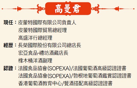 另一方面,餐酒料理搭配這件事又是一門學問,「民以食為天」,不同的紅酒就有分不同品種的葡萄所釀製而成,然可搭配各式的異國料理。如:德國甜白酒、加拿大冰酒適合搭配甜食、水果一起享用,但同時又能搭配麻辣鍋;此外,新世界的甜紅酒口感較甘美,亦可配上重口味,如川菜、上海菜等料理。種種葡萄酒的配對,顛覆過去大眾對紅酒既定的印象,令人驚艷,這也是高曼君所自豪的一點。