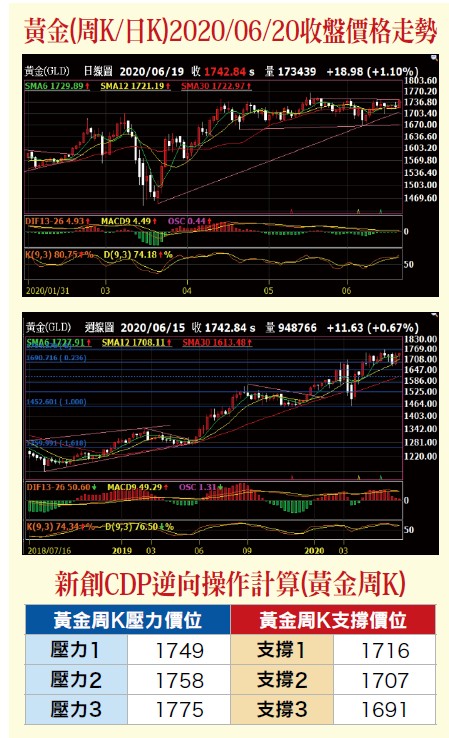 進入六月份以來,海外新冠病毒確診人數,呈現上漲態勢,第二波新冠病毒疫情爆發。市場的避險情緒再度升溫,提振了黃金的避險需求,黃金創一個月最高收盤價一七四三.一三。儘管美國及德國均表達了:不再因二次疫情封鎖經濟,但是預料疫情對經濟的衝擊仍將會不斷延續。此外,美國在疫情爆發之後,連續推出二兆美元的刺激政策,市場預期將再次推出一兆美元的刺激政策。寬鬆的貨幣政策,對於黃金形成有效的支撐。