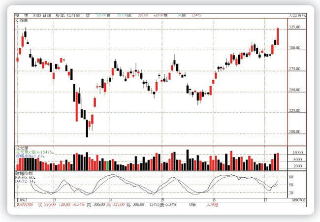 穩懋每年營運從六月開始就會快速攀升到十月,這段期間是每年營運高峰期,今年上半年營收120.6億,年成長49%,半年報預估7元以上。近期股價由5月22日234元漲至7月8日327元,尤其配息7元又填息漲幅44%,股價已突破兩個月箱型整理剛開啟新的一波多頭。