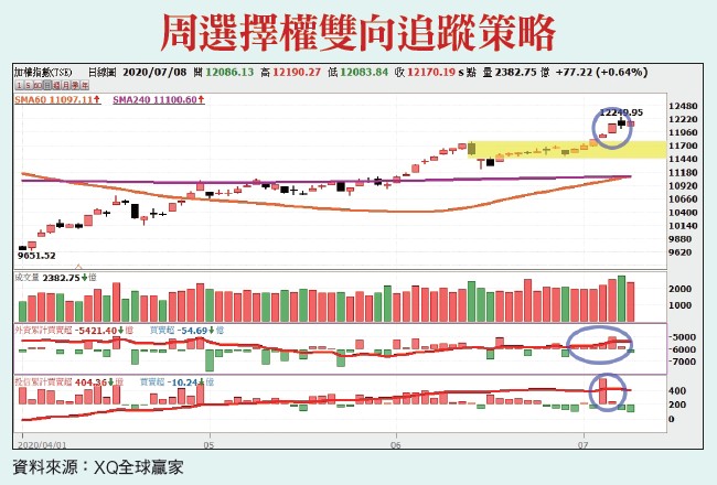 外資在台指期的未平倉淨多單,近期從四萬多口減碼至三萬四千多口,顯示外資的偏多立場暫時轉弱。自營商的選擇權的未平倉,買權Sell Call從七千多口減碼至四千多口。賣權Sell Put則從二萬九千多口加碼至三萬九千多口,顯示自營商預期台股進入盤漲機會升高。整體來看,技術面維持偏多,籌碼則是中性偏多,預期指數接下來將偏向盤漲的走勢,可以溫漲(買權多頭價差)策略進行追蹤。