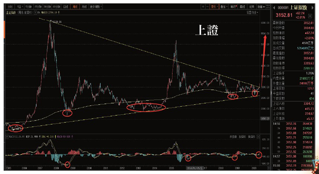 港版國安法七月一日上路,上證指數單周大漲五.八一%,突破二○一五年熔斷崩盤後,「國家隊」進場護盤被套的四一八四高點連接二○一八年美中貿易戰開打的三五八七高點所形成的長期下降壓力線,象徵著上證指數將邁入開市以來第五次牛市(時間長達十三個月以上的定義),行情規模之大,可比二○○七年京奧的九九八低點漲到六一二四高點,或二○一五年一八四九低點漲到五一七八高點。