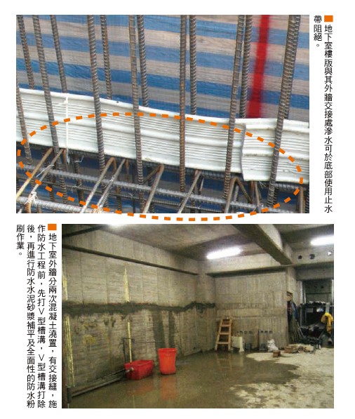 一旦長期有漏水情況發生,將會造成柱牆鋼筋鏽蝕,更有可能會影響大樓的結構安全,為此,地下室外牆各樓層儘可能一次施作,若施工有困難必須分開二次施作時,於二次施作處須確實沖洗,並於地下室外牆泥作粉刷前,打V型槽溝以防水水泥砂漿補平。此外,混凝土澆置前,地下室外牆二次交接處之牆底須充分清洗乾淨,以有效解決樓層接縫及地下室外牆二次接縫之滲水問題。