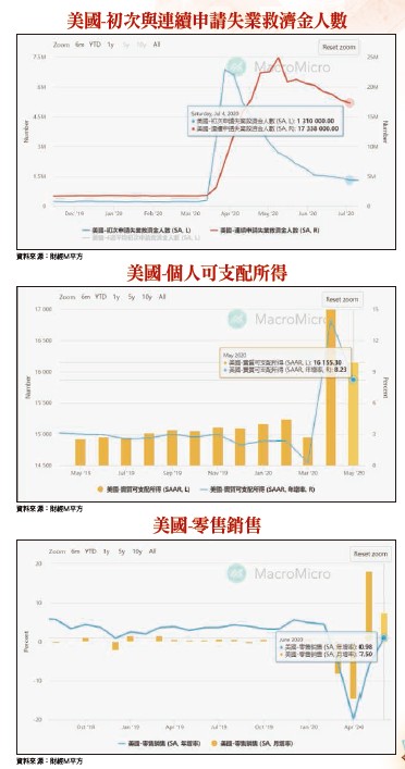 根據美國勞工部數據顯示,截至七月十一日為止的當周,初領失業救濟人數仍達一三○萬人,高於市場預期的一二五萬人,續領失業救濟人數則僅減少四二.二萬人至一七三四萬人,下降速度過慢,將是未來景氣復甦的障礙。幸虧消費數據修復的速度優於預期,打散了市場疑慮。