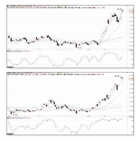 (1)雙鴻最後一波下跌的高點在2011/12/05的高點28.25,於25.25~28.95出現過高的翻空為多的訊號,之後拉回我們可以利用日KD指標的K值出現兩次黃金交叉的訊號+三均糾結的耦合效應,其KD指標戴眼鏡的發動點於2012/01/18出現,隔天長紅為續漲現象,之後往上飆漲到44.2。