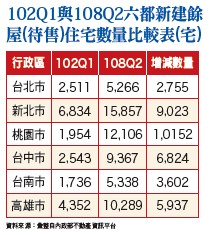 以六都新建餘屋(待售)住宅變化趨勢觀察,新北市自107年第一季起宅數大幅度增加,第三、四季數量下降,108年第一季再度緩升,第二季小幅度下降,桃園市、高雄市皆呈現107年度第三、四季宅數減少,108年度第一季宅數增加,第二季小幅減少之趨勢,台中市自108年第一季起小幅度上升,台南市自108年第一季起小幅度上升,目前略高於台北市水準,台北市自108年起多維持在5,200宅水準。