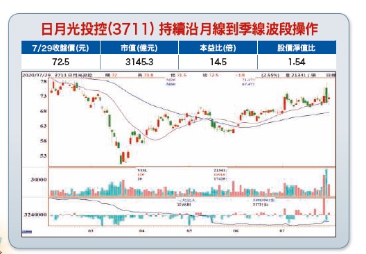日月光投控已順利拿下蘋果iPhone 12內建的SiP系統級封裝,以及AiP整合天線封裝。加上來自聯發科、高通等5G晶片封測訂單大幅成長,以及Wi-Fi模組、超寬頻(UWB)模組、蘋果手錶、非蘋穿戴式裝置等專案,第三季營收可望較第二季雙位數以上成長,法人預估日月光投控今年每股純益可望逼近六元,較去(二○一九)年EPS 3.96元大幅成長超過五成。