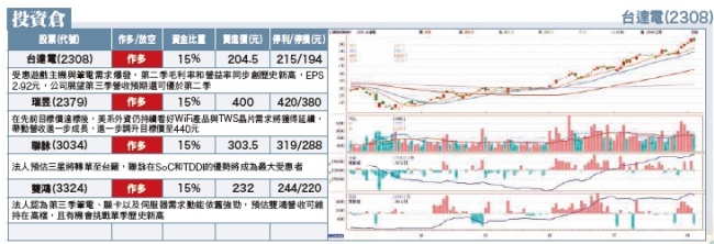 台達電(2308):受惠於遊戲主機與筆電需求爆發,第二季毛利率和營益率同步創下歷史新高,EPS為二.九二元,公司展望第三季營收,預期還可優於第二季。外資法人全面調高台達電目標價,其中匯豐最為看好喊到二百九十元。