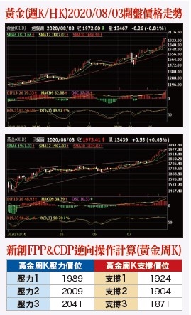 黃金上周最高上漲至每盎司一九八四.二二美元,上漲七十四.三美元,漲幅三.九一%。黃金七月漲幅一○.九二%,創近八年最大單月漲幅!美國Fed上周重申將使用「所有工具」支持美國經濟,並將維持利率在近零水準。直至從新冠病毒疫情的影響中經濟再度復甦。