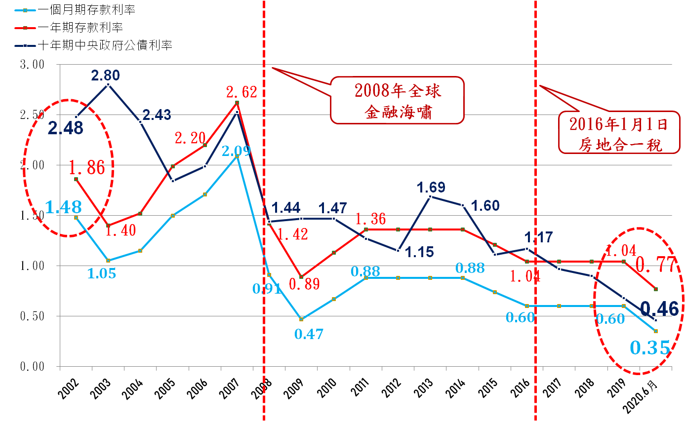 在當前一個月期存款牌告利率0.35%,一年期存款牌告利率0.77%,十年期中央政府公債次級市場利率0.46%情勢下,一般咸認房地收益必然大於利息負擔而加碼購置。