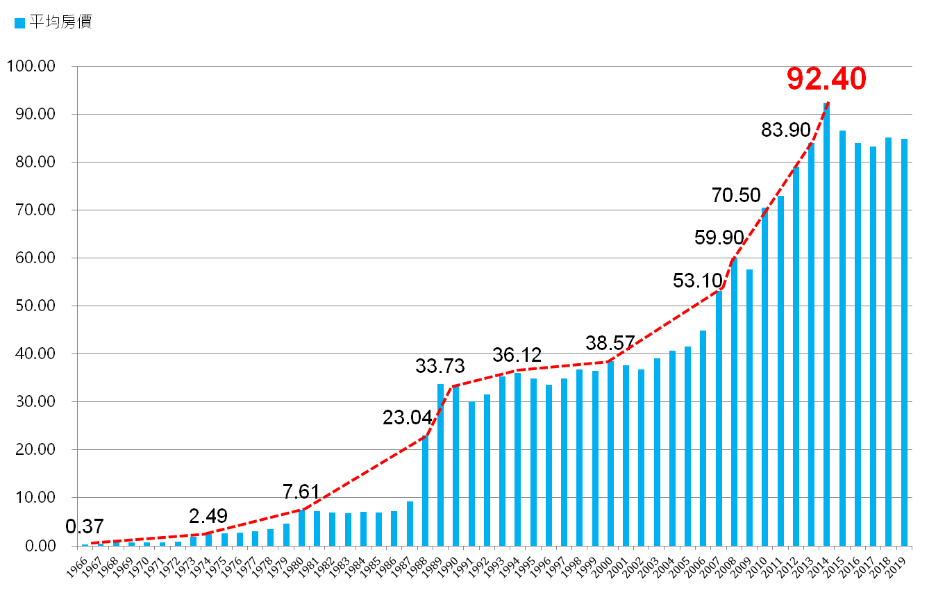就最近這一波房價走勢而言,2003年台北市預售房價每坪39.1萬元,及至2014年最高點每坪92.4萬元,2019年下跌至84.4萬元,今年第二季則又再度攀升至87萬元,此一發展趨勢雖是始料未及,不過如就歷年大漲小回過程,將歷次最高點加以連結,很明顯的大趨勢就是呈現錢多贏家的投資或投機格局。