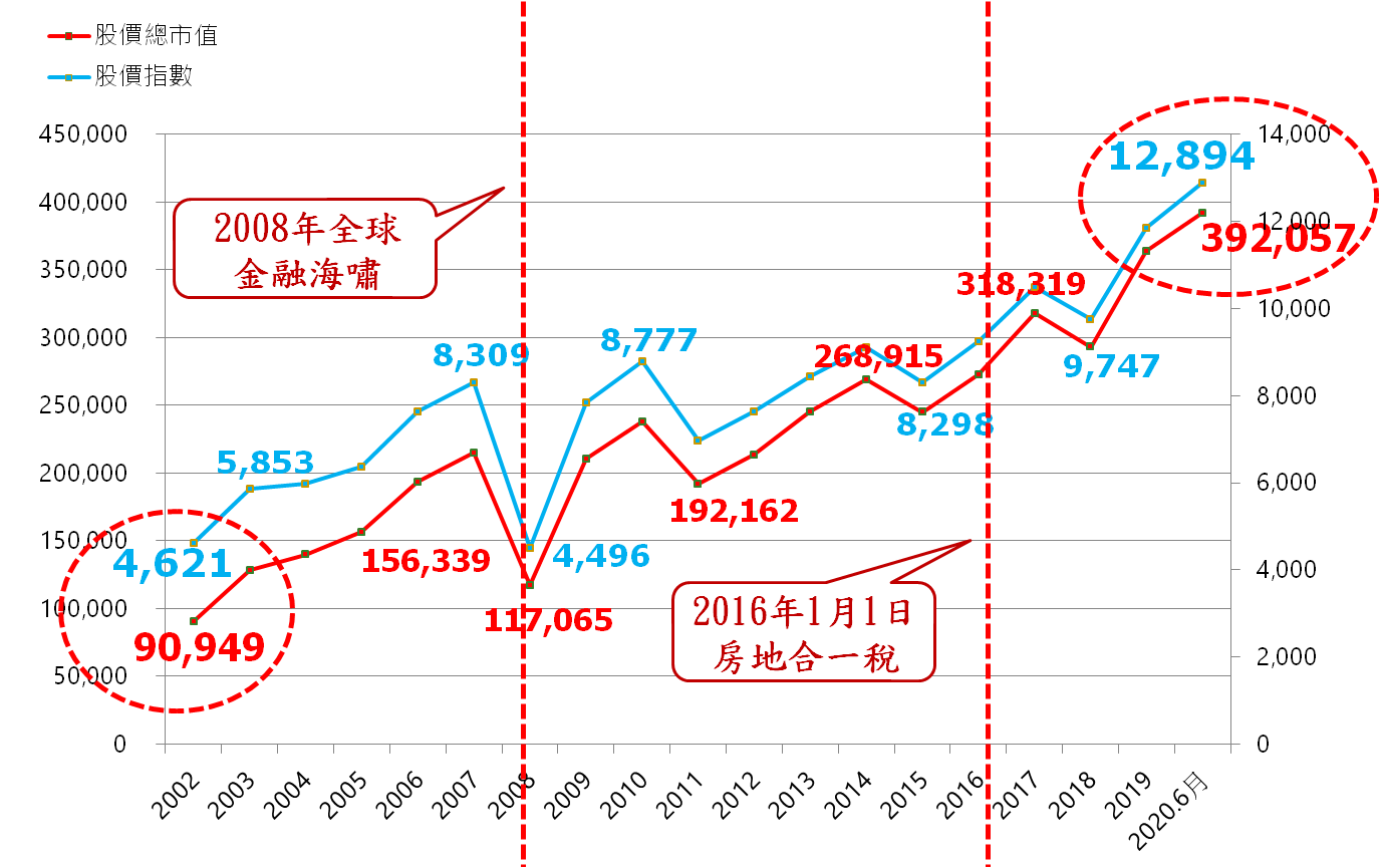 除股價指數再創新高之外,7月28日更創下13,031點之歷史新高,並且截至8月10日股價市值更高達39兆2057億元,此一數據相當於2019年GDP 18.88兆元之2.07倍,另外,2014-2019年連續六年上市櫃公司發放股利都超過一兆元,由此不難了解其對推升房價之影響力道。