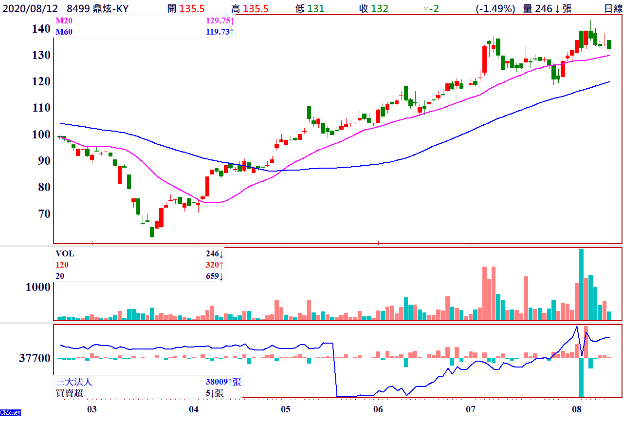 鼎炫-KY(8499):EMI電磁干擾屏蔽材料及衡器廠,公告七月營收二.三二億元,月增率五.二四%,年增率四○.八四%,連續三個月創歷年單月新高。受惠主要工業國家居家辦公、遠距教學應用需求暢旺,帶動筆電、平板電腦等材料拉貨需求持續暢旺,今年前七月累計營收十一.八七億元,創歷年同期新高,年增率一六.四四%。