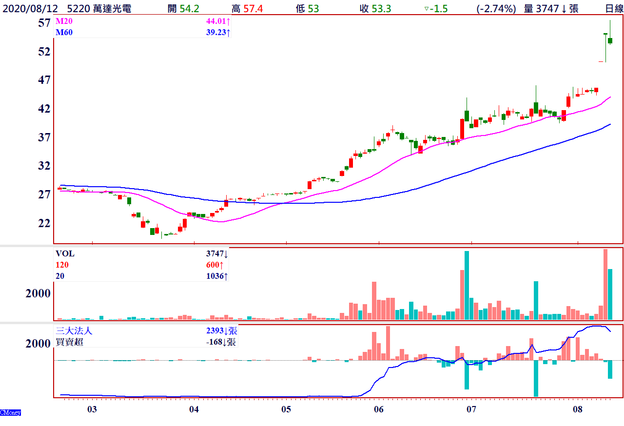 萬達光電(5220):觸控面板廠,公告七月營收一.五九億元,月增率四六.一六%,年增率六九.七二%;今年前七月累計營收六.九三億元,年增率三.八%。