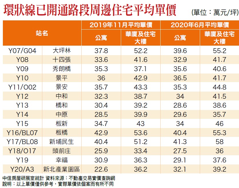 中信房屋依據實價登錄資料進行統計,從通車前的二○一九年十一月的平均房價調查到真正通車後,截至二○二○年六月底的資料,可以發現除了部分捷運站外,大多數的捷運站的房價都往上漲。