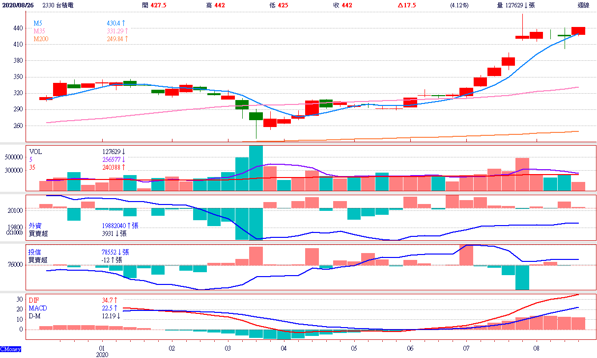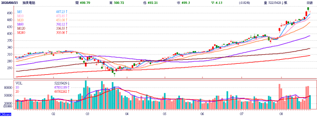 八月十九日的聯準會所公布的七月會議紀錄,成為扭轉資金想法的關鍵訊息,科技股再度回到資金懷抱,那斯達克指數天天創新高,美股帶動台股評價調升故事未完待續,台積電(2330)技術論壇確立與競爭者3D先進封裝的領先差距,在高階晶片代工市佔率提升趨勢也有利股價表現。